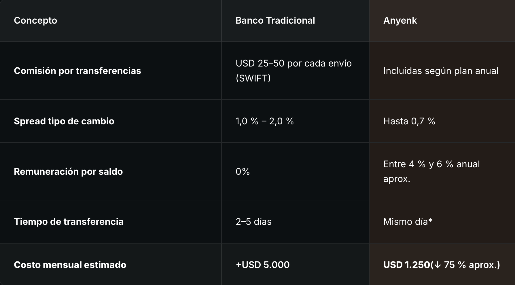 El costo de cada pago internacional es significativamente menor que el de una transferencia bancaria tradicional. Anyenk ofrece tarifas competitivas, menor spread de tipo de cambio y elimina muchos costos asociados a bancos intermediarios, lo que permite optimizar el flujo de caja.